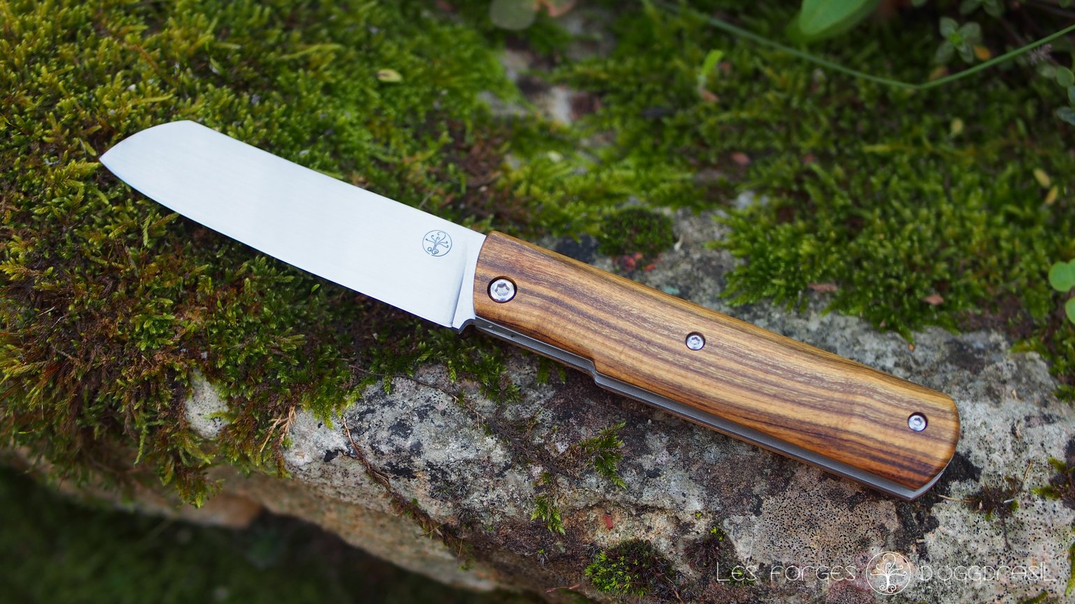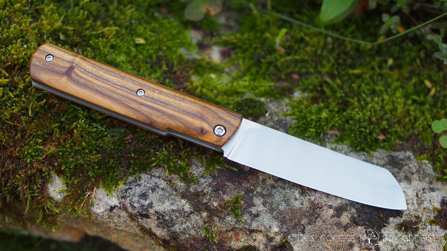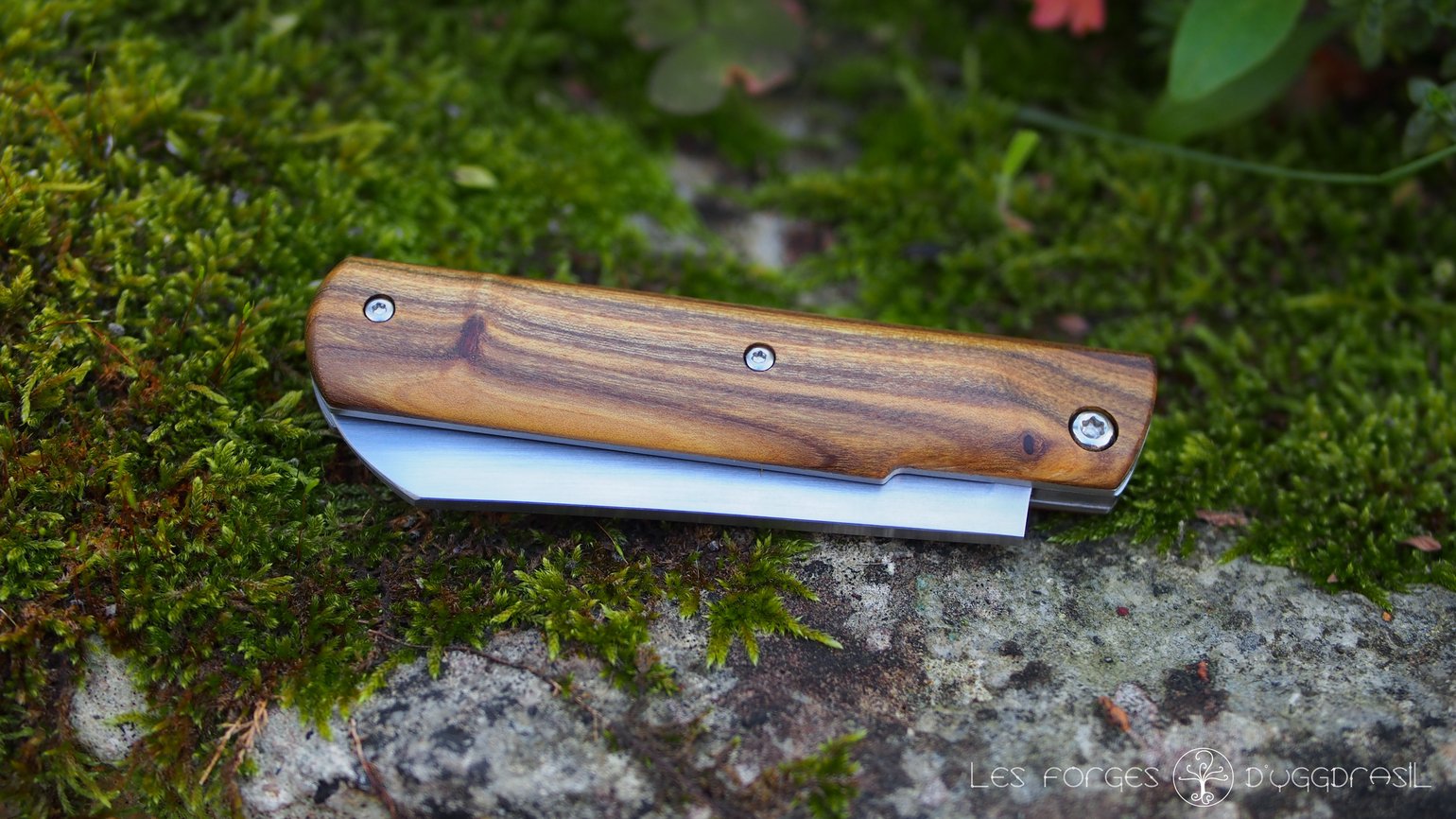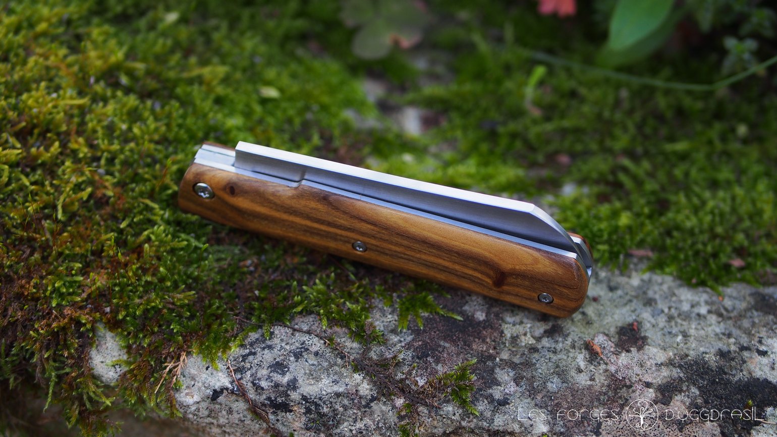 Ce couteau pliant de type cran carré, avec une lame en acier inox, est entièrement réalisé dans ma forge.